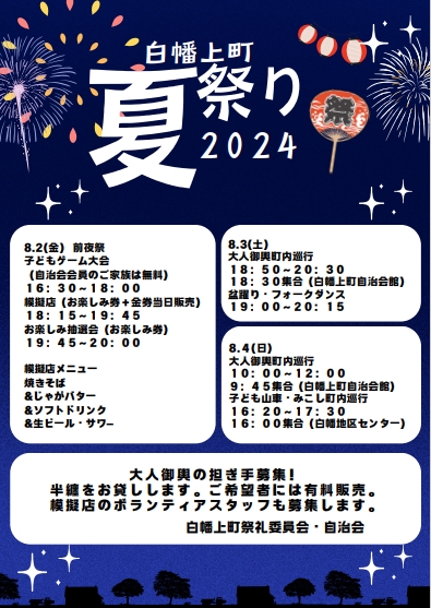 前夜祭(模擬店ボランティアスタッフ募集)、大人御輿の担ぎ手募集、大人御輿半纏販売をします。