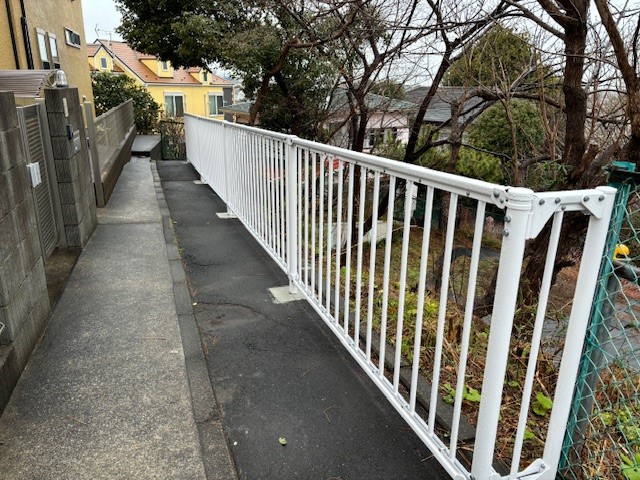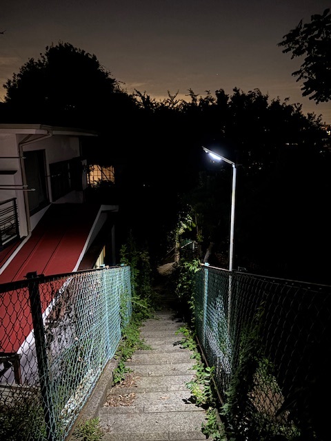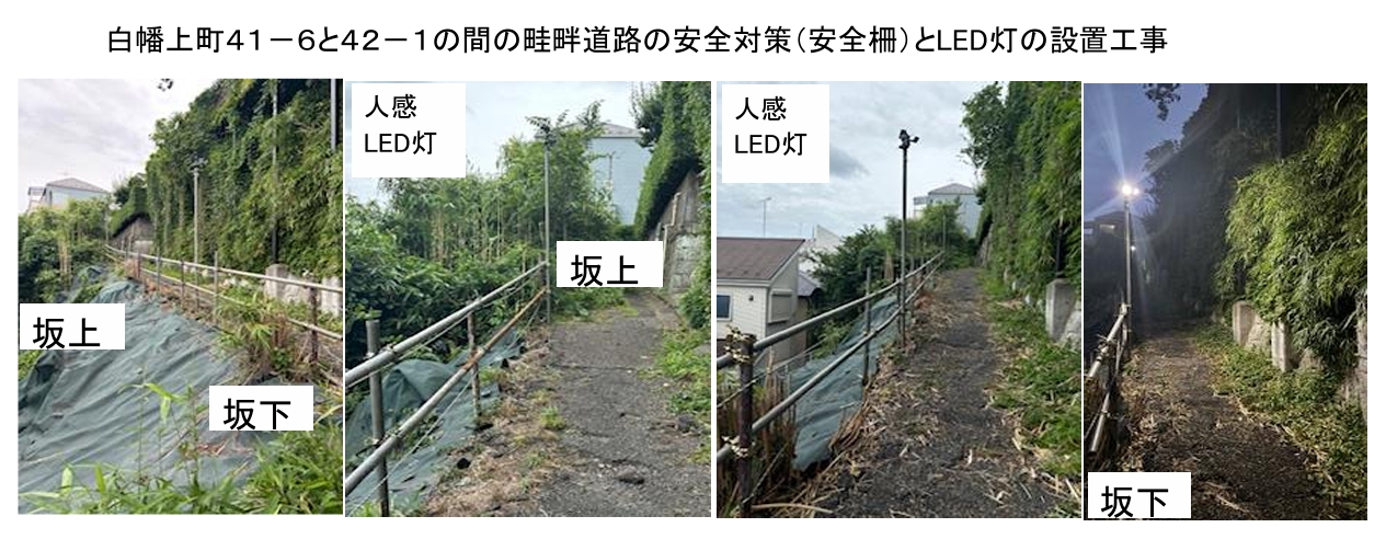 大規模災害が発生し、家屋の延焼が急速に拡がって適切な避難経路が閉ざされる事態が起きた時に、バス通りに緊急避難できるルートの安全性向上対策工事を実施しました。6月9日完工。工事内容は、道路わきの傾斜地への転落防止柵設置と人感センサー付きLED灯設置です。役員のDIYで行いました。
