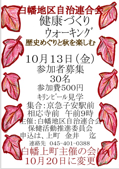 自治会館出発時間を10時ー>10時15分に変更します。(集合時間は9時45分)