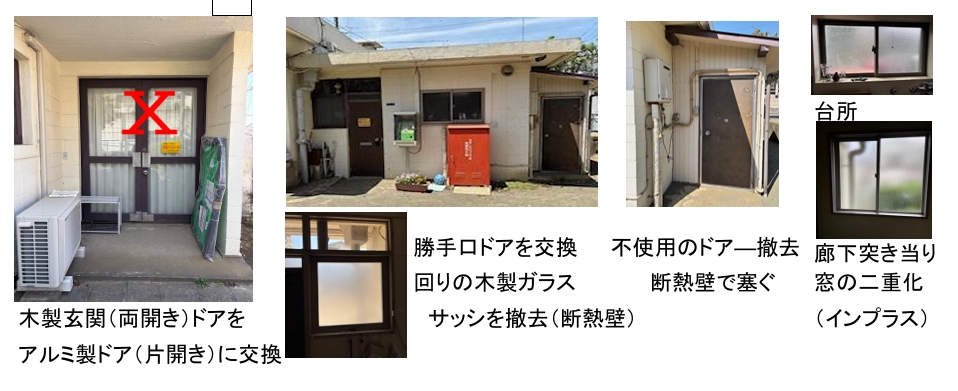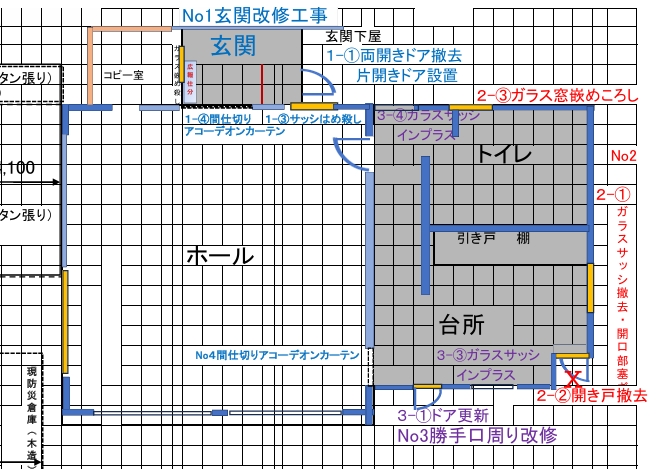 横浜市の脱炭素化推進事業補助金が決定されましたので、下図網掛部分の改修を行います。並行して、自治会資金でホール西側の古い木製ガラス戸の撤去・嵌め殺し工事も行います。
